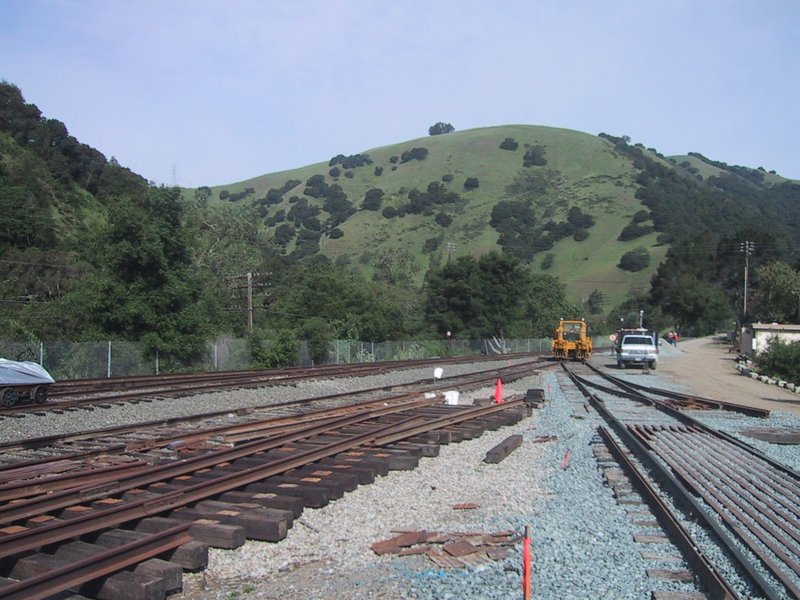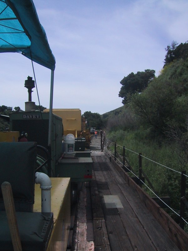 A view from the front of the work train. The deck is part of the bridge over the roadway, Highway 84, below. | |